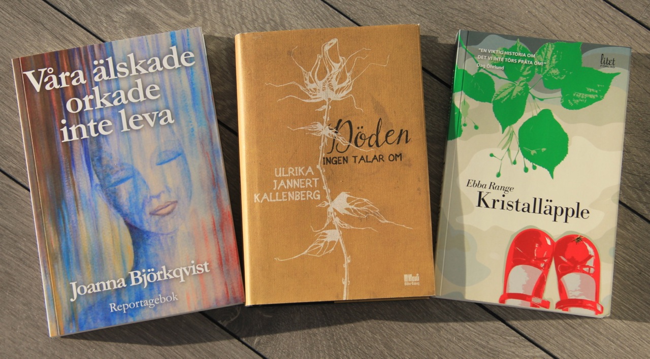 Vi kommer även att få sällskap av Ebba Range som dels medverkar i min reportagebok där hon öppenhjärtigt delar med sig av hur det varit att ha förlorat tre familjemedlemmar i självmord och dels skrivit den fiktiva romanen Kristalläpple som handlar om två tvillingflickor, där den ena tar sitt liv. Även om romanen är en fiktiv historia har den tagit ett tydligt avstamp i Ebbas eget liv och tack vare att hon skrev den har hon äntligen blivit fri från skammen som hon burit på under alla år.