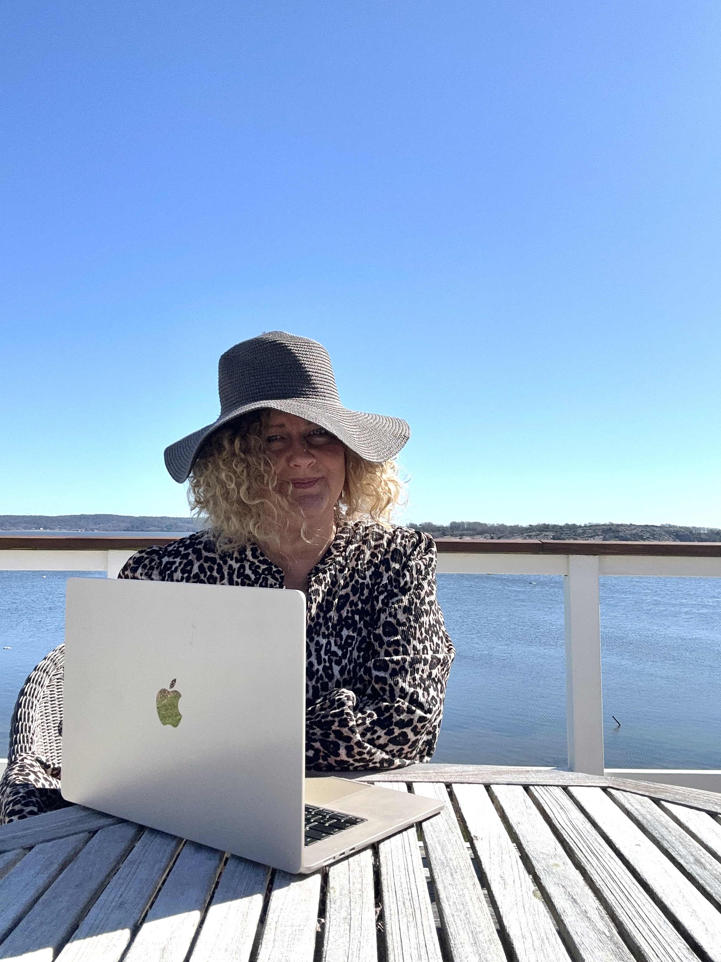 Efter en snudd på evighetslång och dessutom iskall vinter följd av en ovanligt grå marsmånad kan jag äntligen sitta ute och läsa manus igen. Som jag har längtat! Med solhatten på går det utmärkt att läsa vad som står på skärmen och jag njuter verkligen av den klarhet i hjärnan som frisk luft ger.