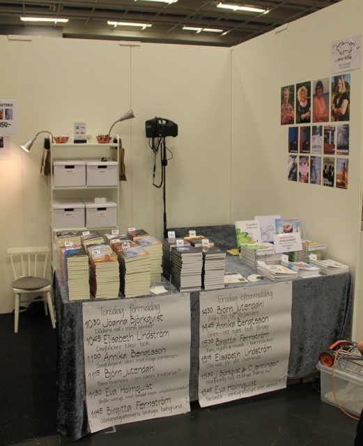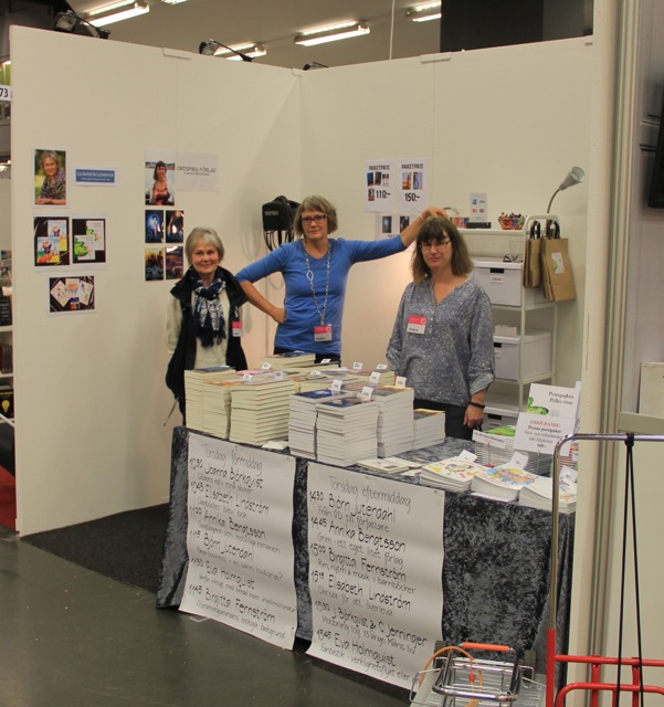 Som jag lovade igår kommer här hela det gedigna monterprogrammet som gäller för oss i monter B04:73 på Bokmässan i Göteborg 24 -27 september 2015. En och en halv timme på förmiddagen och lika lång tid på eftermiddagen kommer vi sex författare i montern att ha varsin kvart. Vi kommer att intervjua varandra kring våra böcker och vårt författarskap. Efter våra samtal kommer det finnas möjlighet att köpa böcker till fördelaktigt mässpris och självklart också få dem signerade om man så önskar.