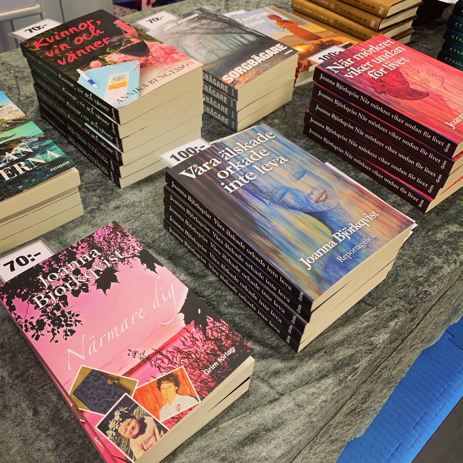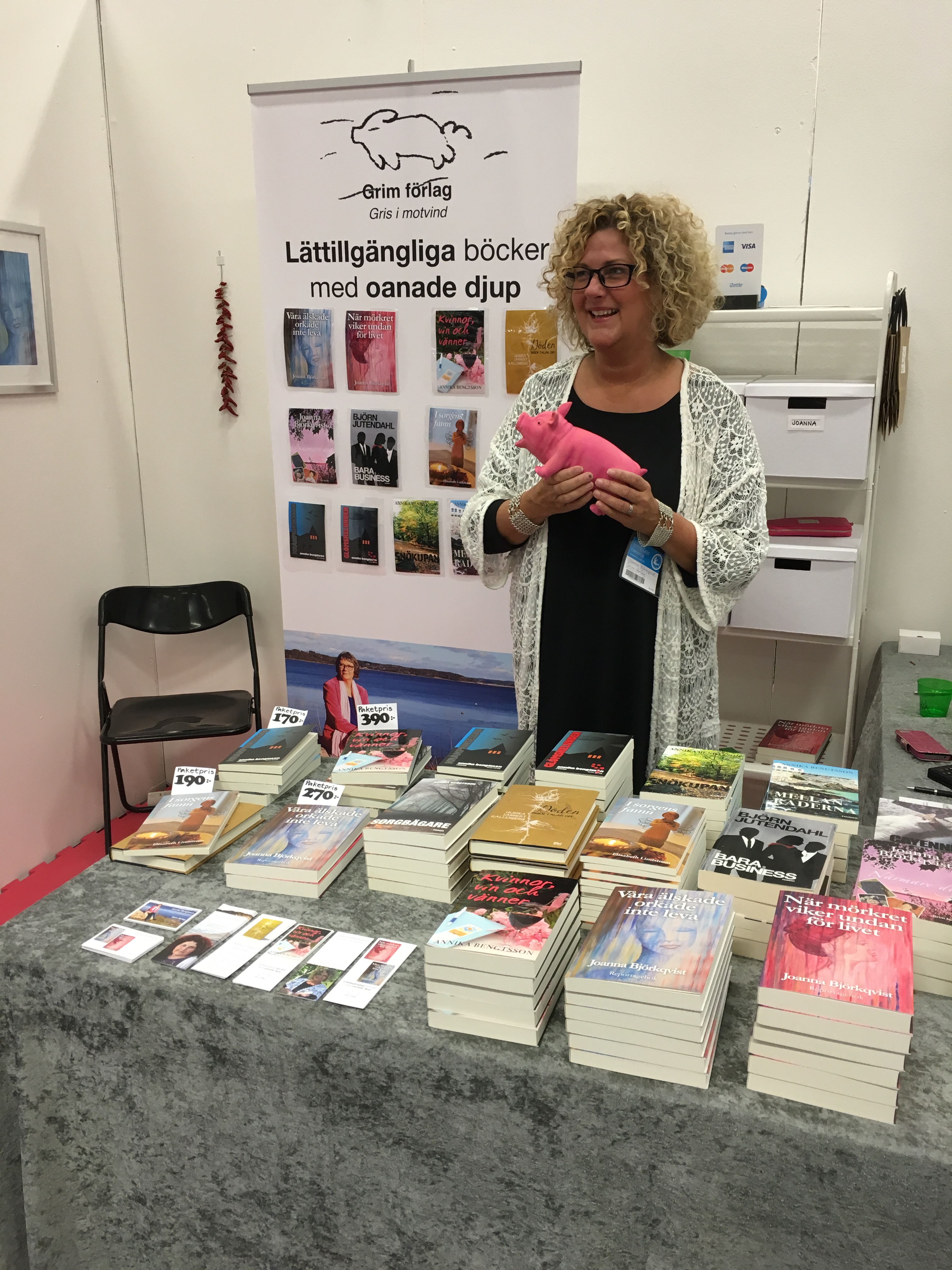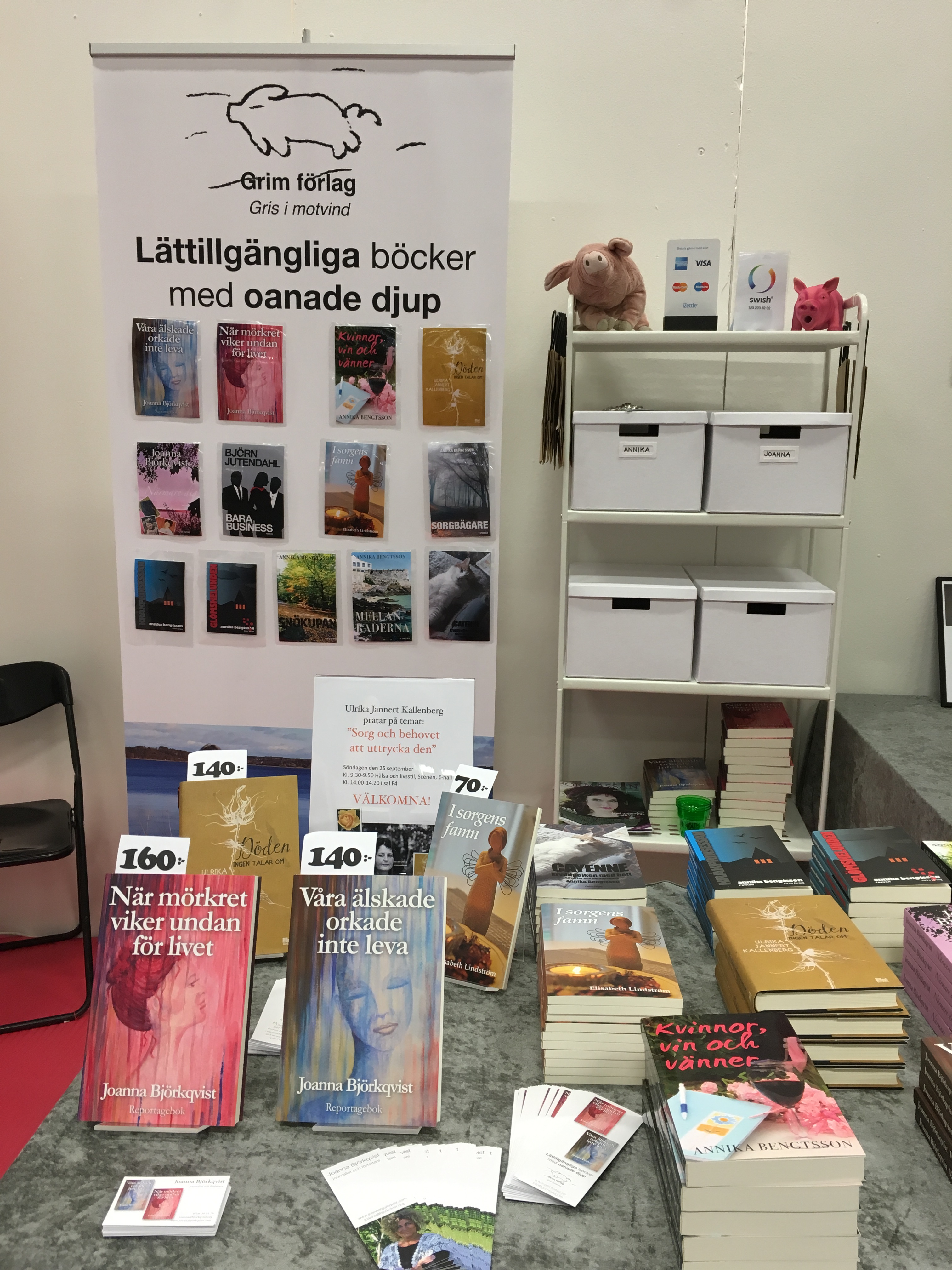 Det var ett speciellt år på Bokmässan i år och ett stort skäl till det var att min kära vän och förläggare Annika Bengtsson och jag redan från början hade bestämt oss (på riktigt denna gång!) för att det här var sista gången vi stod i Grim förlags monter. Åtminstone under överskådlig tid. Mycket av det vi gjorde gjorde vi därför för sista gången och det är klart att det kändes i hjärtat. Jag skruvade ihop den praktiska bokhyllan för sista gången, vi lade upp alla våra fina bokhögar för sista gången, och vi pratade med massor av folk för (både första och) sista gången som utställare i monter B04:79.