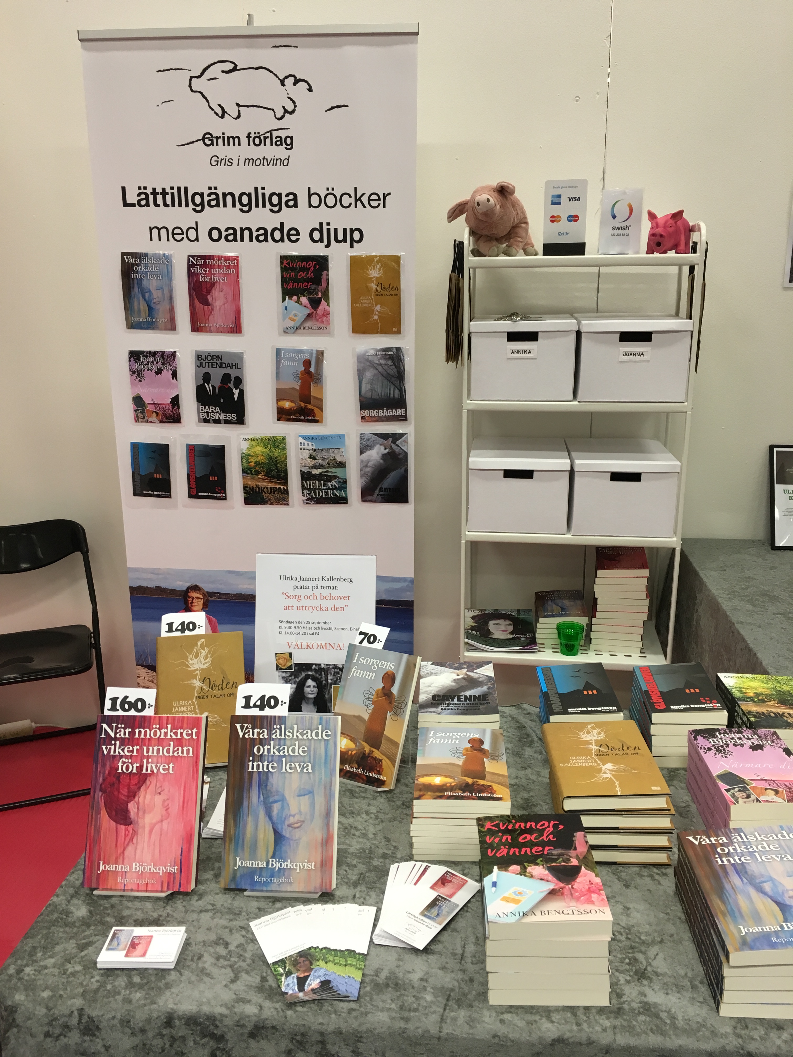 Det var ett speciellt år på Bokmässan i år och ett stort skäl till det var att min kära vän och förläggare Annika Bengtsson och jag redan från början hade bestämt oss (på riktigt denna gång!) för att det här var sista gången vi stod i Grim förlags monter. Åtminstone under överskådlig tid. Mycket av det vi gjorde gjorde vi därför för sista gången och det är klart att det kändes i hjärtat. Jag skruvade ihop den praktiska bokhyllan för sista gången, vi lade upp alla våra fina bokhögar för sista gången, och vi pratade med massor av folk för (både första och) sista gången som utställare i monter B04:79.